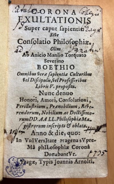 The Crown of Exultation upon the Head of a Wise Man, or the Consolation of philosophy, once presented in five books by Anicius Manlius Torquatus Severinus Boëthius to all worshipers of true wisdom, whether disciples or professors. Now again ascribed and dedicated to the honour, love, and consolation of the most illustrious, highborn, venerable, noble, and most learned masters of liberal arts and philosophy. In the year and on the day when they were awarded the highest philosophical crown at the University of Prague – 1675.