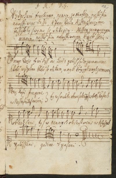 A unique notated song added by Fr. Jiří Josef Čapek (Georgius Josephus Cžapek), S.J. (1648-1680), to his Czech anthology of Boëthius’ writing De consolatione philosophiae. The manuscript of the small format and scope (14 fols.) bears the title Potěšení zarmoucených, s kterým všichni v zármutku, v neštěstí, v bídách, v chudobě, v nemocích, v soužení postavení lidé potěšiti se a vyraziti mohou. K potěšení urozený a statečný paní Eleonory Polexyny Lydmyly Smilkovský rozený z Blauvensteinu z knížky Anicia Manlia Severina Boëthia de Consolatione Philosophica sebraný a na česko vyložený letha 1678 [The Consolation of the Sorrowful, with which All People in Sorrow, in Misfortune, in Miseries, in Poverty, in Diseases, in Tribulations Can Rejoice and Overcome. To the Solace of the Noble and Brave Lady Eleonora Polexyna Lydmyla Smilkovský Born of Blauvenstein, from the book by Anicius Manlius Severinus Boëthius, De Consolatione Philosophica collected and translated into Czech in 1678].