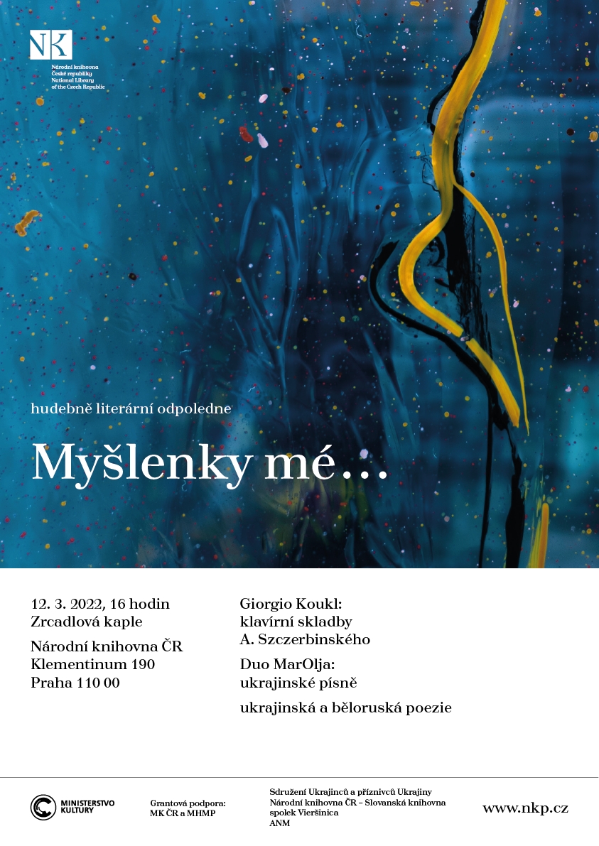 The Association of Ukrainians and Supporters of Ukraine and the Slavic Library are organizing a musical and literary afternoon: My thoughts... on Saturday, March 12, 2022 at 4:00 pm in the Mirror Chapel of the Clementinum.